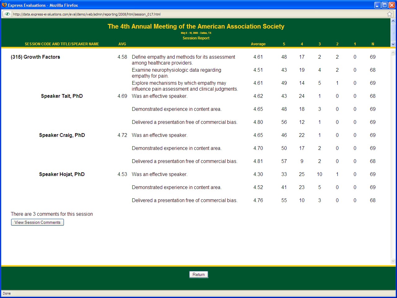 Session-specific comments - Comments can be recorded with each session evaluation. This is especially important for reviewing the success of each session and when providing feedback to your speakers (see Session Report). |