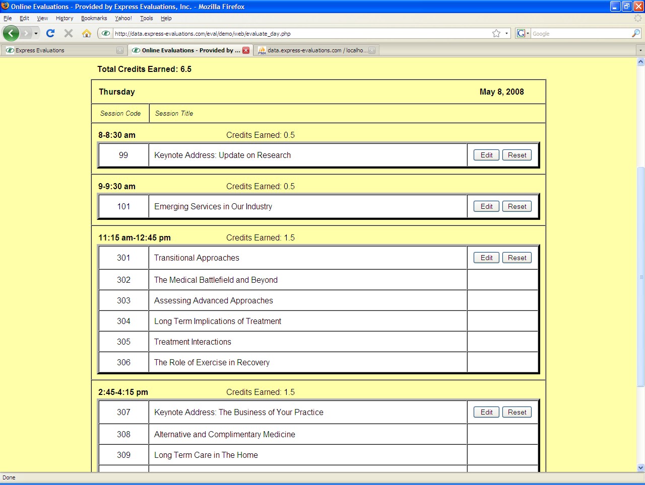 Time Slot Conflicts - Often, conferences are organized with concurrent sessions during some time slots. In order to prevent attendees from accidentally evaluating and/or claiming credit for two concurrent or overlapping sessions, we use our time slot conflict management feature. Once a session is evaluated/claimed, all concurrent or overlapping sessions are locked out for the attendee. |