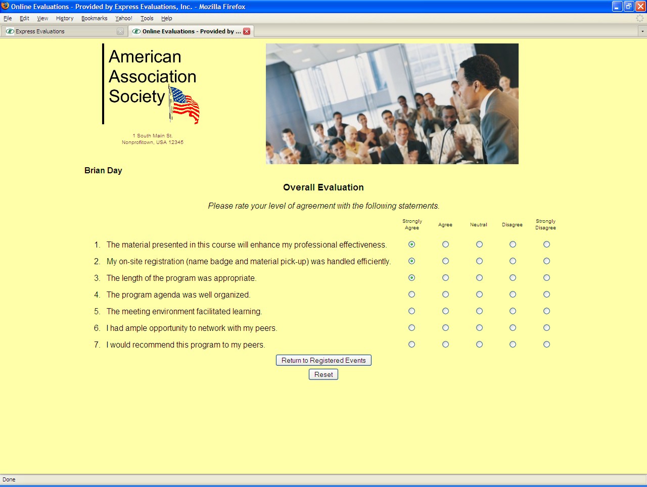 Speaker/Presenter objectives and disclosures - Speaker names and disclosures can be included with their evaluation criteria. Normally, speakers are evaluated against a standard set of objectives. This allows for a ranking of speakers amongst their peers (see Speaker Ranking Report). |